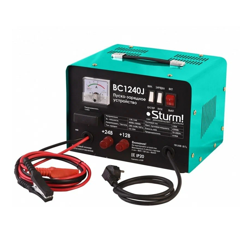 Пуско-зарядное устройство 220В,12/24В,4200Вт,10/20А, пусковой ток 120А, до 300Ач, BC1240J Sturm! — портативное трансформаторное пуско-зарядное устройство, для зарядки свинцово-кислотных аккумуляторных батарей напряжением 12 или 24 Вольта, емкостью от 70 до 300 Ач, а также для помощи при запуске двигателей рабочим объемом до 2 литров, после продолжительной стоянки или в условиях низких температур, когда недостаточно емкости основного аккумулятора. Важное достоинство Sturm BC1240J — небольшие массово-габаритные показатели — вес устройства составляет всего 7,5 кг, что позволяет без больших усилий перемещать его с места на место. Кроме того, модель имеет металлический корпус, защищающий компоненты устройства от возможных механических повреждений. Модель обладает интуитивно понятным управлением и проста в эксплуатации. Перед началом использования пользователю необходимо выбрать необходимое напряжение: 12 В или 24 В и закрепить один из проводов с зажимом на соответствующей клемме устройства. Необходимые параметры работы устанавливаются с помощью соответствующих переключателей на панели управления. На выбор предусмотрено для режима зарядки — с силой тока в 10 А, либо в 20 А (позволяет полностью зарядить 60 Ач аккумулятор менее, чем за 7 часов), а также режим запуска двигателя с пусковым током в 120 А. Для визуального контроля показателей зарядного и пускового тока используется стрелочный амперметр. В процессе зарядки батареи устройство автоматически снижает силу тока, что позволяет избежать закипания электролита внутри. Для обеспечения безопасности пользователя в случае любых внештатных ситуаций модель оснащена необходимым комплексом защиты: от перегрева, от короткого замыкания, от неверной полярности подключения. В комплект поставки устройства входят провода с зажимами, а также пара плавких 40 А предохранителей.