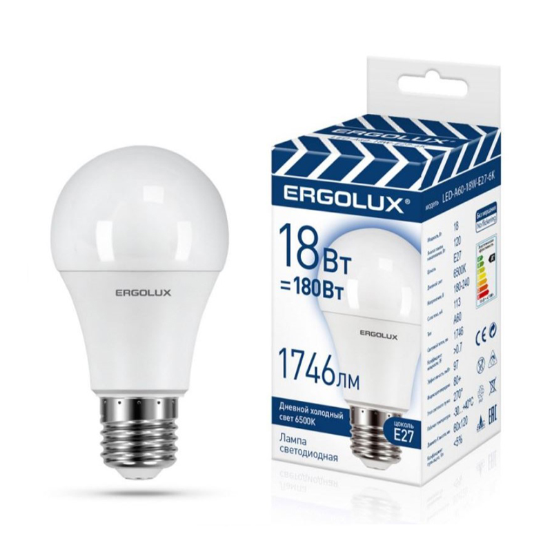 Ergolux LED-A60-18W-E27-6K Эл.лампа светиодиодная ЛОН 18Вт Е27 6500К