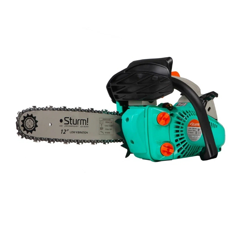 Бензопила Sturm! GC9912 — Практичная бензопила компактной конструкции для выполнения работ в стесненных условиях отличается маневренностью и удобством в эксплуатации. Верхнее расположение основной ручки позволяет производить обрезку веток для формирования кроны деревьев без приложения дополнительных усилий. Хорошая мощность, малый вес и компактная сбалансированная конструкция корпуса позволяют оператору легко управлять бензопилой даже находясь на высоте. Бензопила оптимально подходит для работ по уходу за деревьями. Модель прошла комплекс мер по подготовке к суровой эксплуатации и способна эффективно работать как в сильную жару, так и в условиях низких температур. Двигатель с хонингованной, покрытой твёрдым хромом поршневой группой, прекрасно сбалансирован, стабильно работает без потери мощности при изменении положения инструмента. Система стабилизации двигателя обеспечивает достаточную производительность в широком диапазоне оборотов и мгновенное ускорение цепи для более эффективного пиления. Система легкого старта позволяет бесперебойный запуск двигателя без особых усилий. Дополнительно предусмотрен праймер подкачки топлива для обеспечения возможности завести холодный мотор бензопилы в сложных условиях. Постоянную готовность к работе поддерживает возвратный механизм стартера автоматически приводя его в пусковое положение для выполнения быстрого последующего запуска. Регулируемый масляный насос приостанавливает смазку при работе в холостом режиме и позволяет настраивать подачу масла в соответствии с потребностями. Безопасность работы обеспечивается предохранительной клавишей, предотвращающей случайное нажатие газа, ограничителем цепи, защитным щитком для правой руки, а также цепным тормозом, активируемым принудительно либо силой инерции. Два способа активации тормоза цепи повышают безопасность труда. Усиленный картер двигателя и кованый коленчатый вал обладают исключительной прочностью и долговечностью. Антивибрационная система эффективно поглощает вибрацию и защищает здоровье оператора. Эргономичное расположение рукояток относительно центра тяжести делает инструмент удобным и хорошо сбалансированными, что позволяет комфортно управлять им в любых ситуациях. Удобное крепление крышки двигателя существенно облегчает чистку и замену свечи и воздушного фильтра.