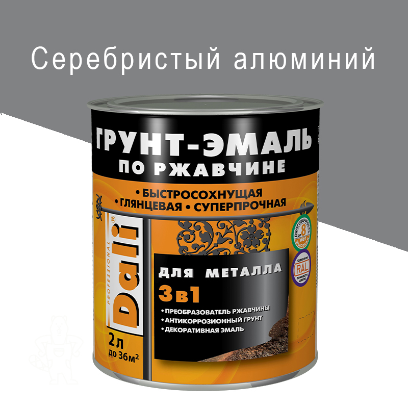 ГРУНТ-ЭМАЛЬ ПО РЖАВЧИНЕ «DALI» 3 В 1 СЕРЕБРИСТЫЙ АЛЮМИНИЙ (RAL 9006) 2,0 Л