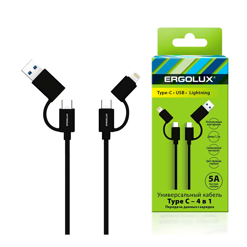 Купить Кабель USB/TYPE-C—TYPE-C/LIGHTING 1,2м ЧЕРНЫЙ ERGOLUX