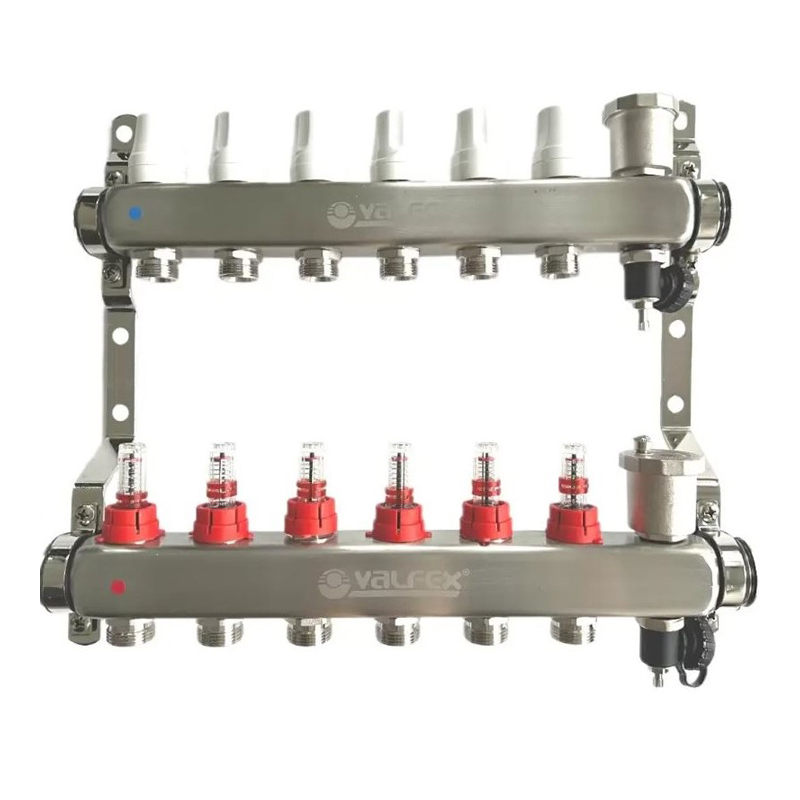 Главная МАГАЗИН САНТЕХНИКА (ПП) Отопление,баки, краны Коллекторная группа НЕРЖ со встр.расх.в сборе 1″*6вых. Евроконус 3/4 VALFEX