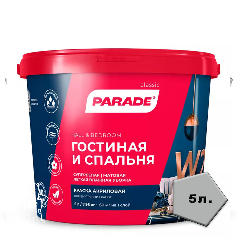 Купить Краска акрил. PARADE W2 Гостиная и Спальня Бел. мат. 5л. в Ликино-Дулево с доставкой по городу и в другие города.