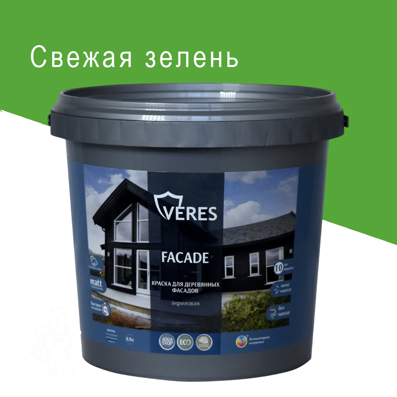 Главная МАГАЗИН ЛКМ Kраски Veres КРАСКА «FACADE» ДЛЯ ДЕРЕВ.ФАСАДОВ АКРИЛ СВЕЖАЯ ЗЕЛЕНЬ 9 Л