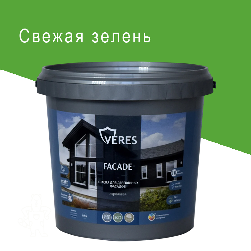 Главная МАГАЗИН ЛКМ Kраски Veres КРАСКА «FACADE» ДЛЯ ДЕРЕВ.ФАСАДОВ АКРИЛ СВЕЖАЯ ЗЕЛЕНЬ 0,9 Л