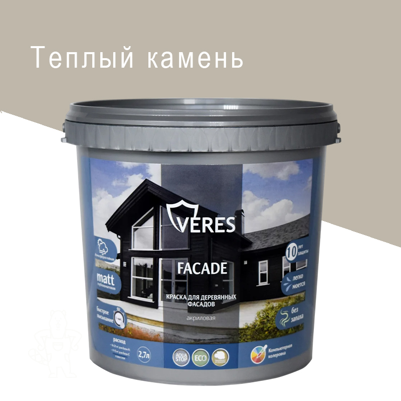 Главная МАГАЗИН ЛКМ Kраски Veres КРАСКА «FACADE» ДЛЯ ДЕРЕВ.ФАСАДОВ АКРИЛ ТЕПЛЫЙ КАМЕНЬ 2,7 Л