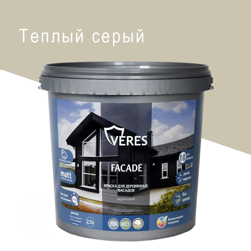 Главная МАГАЗИН ЛКМ Kраски Veres КРАСКА «FACADE» ДЛЯ ДЕРЕВ.ФАСАДОВ АКРИЛ ТЕПЛЫЙ СЕРЫЙ 2,7 Л