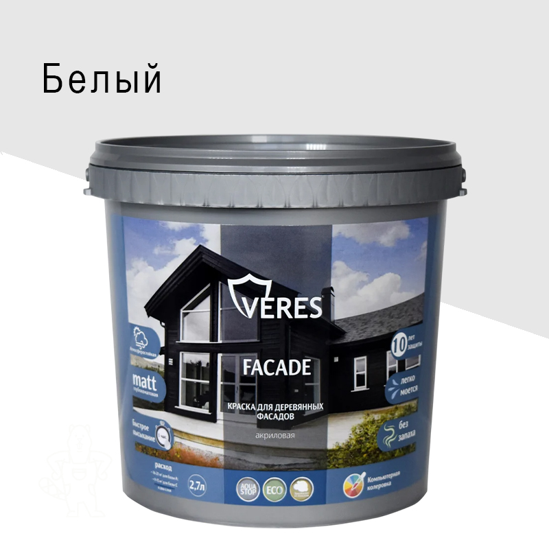 Главная МАГАЗИН ЛКМ Kраски Veres КРАСКА «FACADE» ДЛЯ ДЕРЕВ.ФАСАДОВ АКРИЛОВАЯ БАЗА А 2,7 Л