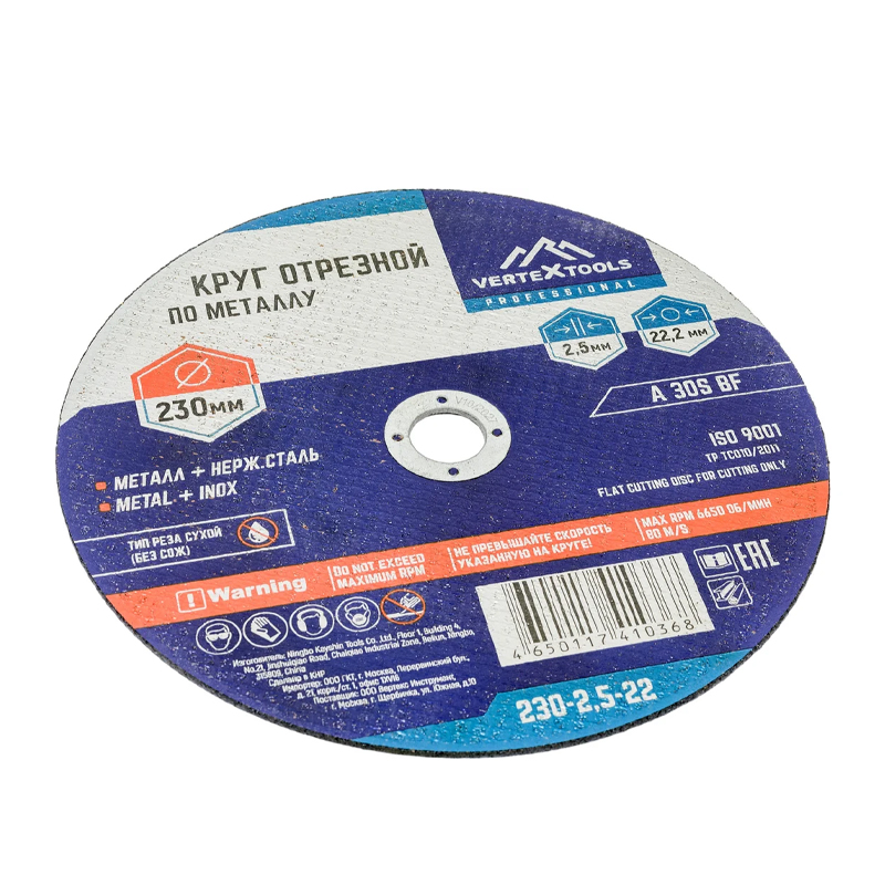 Круг отрезной по металлу 230×2.5×22 мм vertextools 230-2,5-22 позволяет эффективно пилить листы из черного и цветного металла, резать металлические профили и трубы.