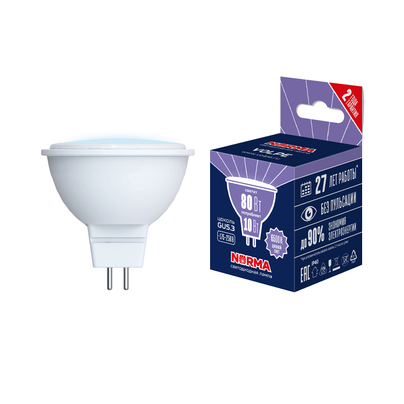 Главная МАГАЗИН ЭЛЕКТРИКА Лампы Uniel LED-JCDR-10W/6500K/GU5.3/NR Лампа светодиодная. Форма «JCDR», матовая. Серия Norma. Дневной белый свет (6500К). TM Volpe