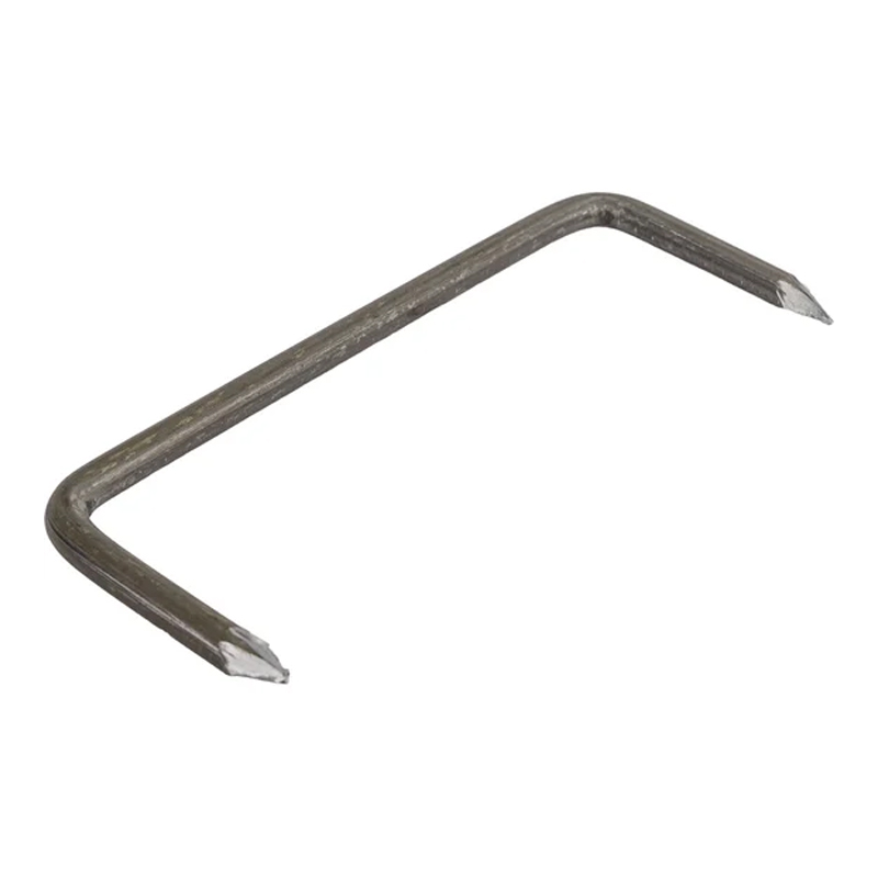 Это крепеж, состоящий из заостренных ножек с насечками и спинки. Ножки могут быть прямыми, развернутыми или повернутыми (когда они находятся под углом в 45°). Концы скобы делают острыми и четырехгранной формы. Нередко там делают насечки, чтобы предотвратить самопроизвольное выпадение изделия. В местах сгиба скобу могут дополнительно расплющить.