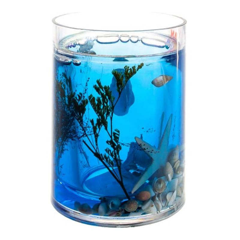 Изделие выполнено из пластика с декоративным гелевым наполнением (ракушки, рыбки). Емкость прямоугольной формы. Влагоустойчива.
